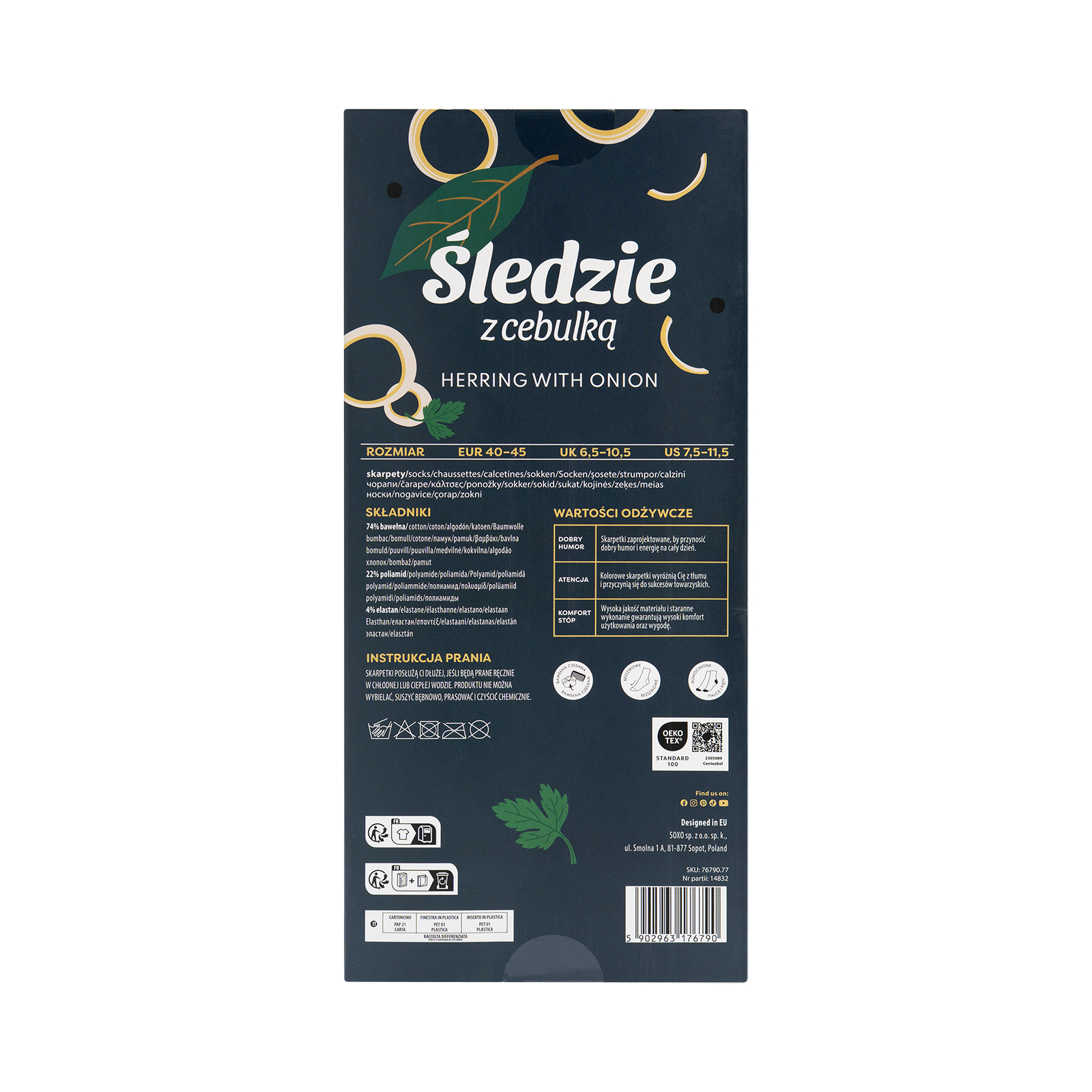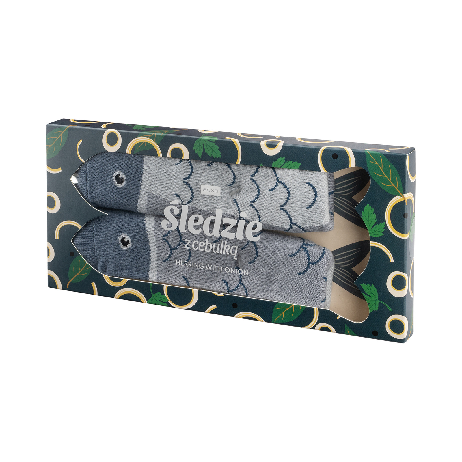 - Wesołe skarpetki Śledzie z cebulką w opakowaniu to idealny model dla fanów morskich podróży. Zabawny model sprawdzi się jako pomysł na prezent dla mężczyzny w każdym wieku. Uzupełnij swoją garderobę ciekawymi wzorami.