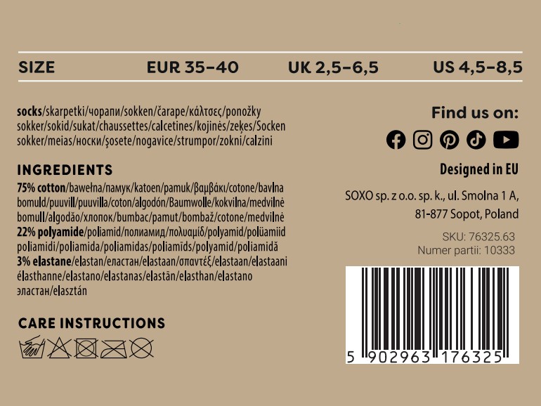 • Bawełniane skarpetki SOXO łączą modę i wygodę noszenia to połączenie, które pokochasz od pierwszego założenia! Kolorowe skarpetki sprawią, że uśmiech na twarzy będzie Ci towarzyszył cały dzień! Poczuj się wyjątkowo i zrób sobie prezent.