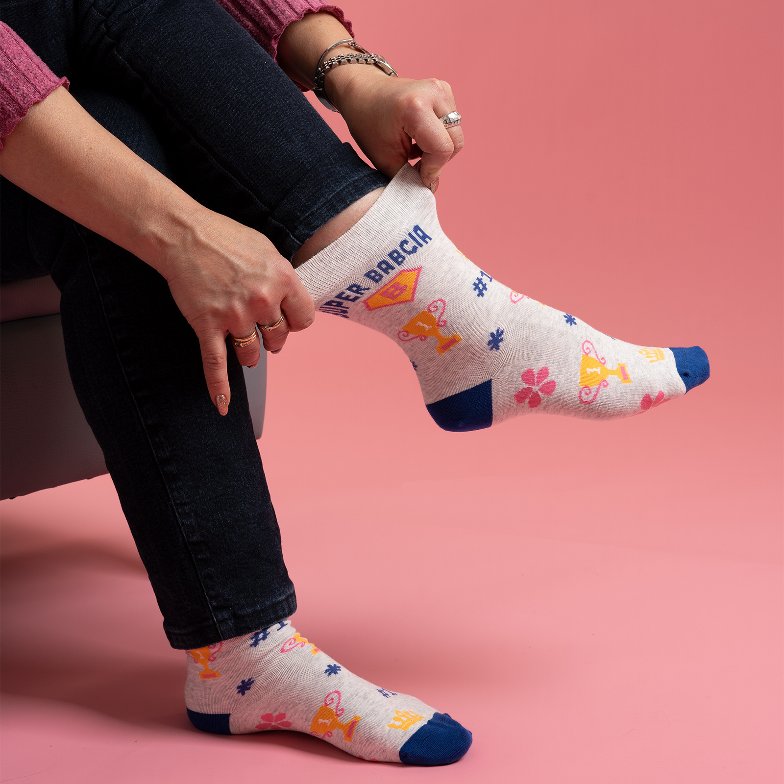 Wesołe skarpetki z napisem super babcia to idealny gadżet, który możesz podarować w prezencie. Wygodne i zabawne egzemplarze skarpetek, to modny dodatek do stylizacji.