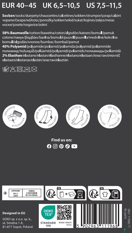 - Skarpetki SOXO zawrócą Ci w głowie! To co je wyróżnia to żywe kolory, ciekawe wzory i niesamowita wygoda, za którą odpowiada najwyższej jakości materiał! Wyrażaj swój styl i nastrój kolorowymi skarpetkami i czuj radość każdego dnia!