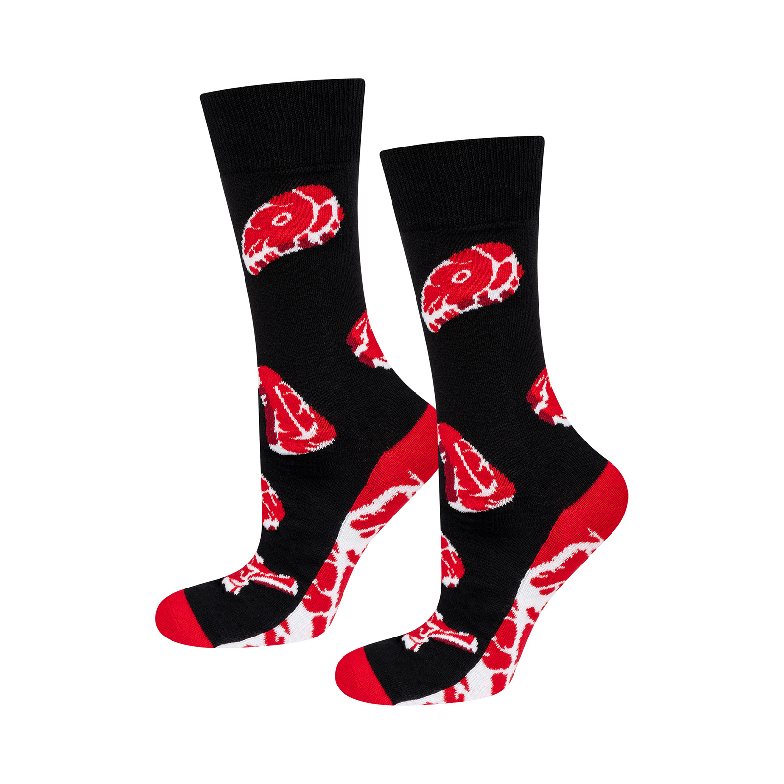 - Skarpetki męskie dla największych fanów soczystych steków. Zapakowane w oryginalne pudełko do złudzenia przypominają mięso z lady. Ich miękki materiał zapewni komfort noszenia. Te kolorowe skarpetki to styl, klasa i modny look.