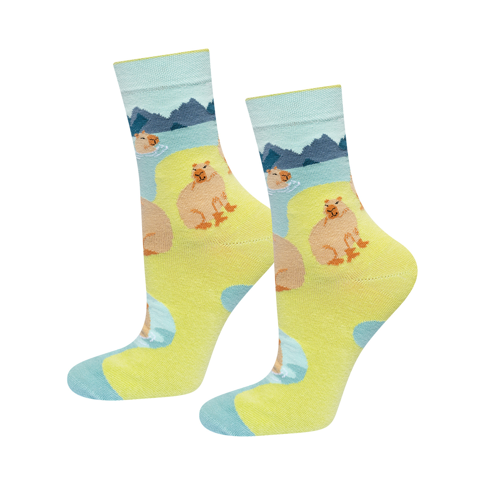 Skarpetki z motywem kapibary w wodzie to nie tylko zabawne skarpetki, ale również wesoły pomysł na prezent. Ten model został przygotowany z myślą o miłośnikach unikatowych wzorów. Nie bój się eksperymentować i bawić modą. Nasze skarpetki z pewnością przykują uwagę i pozbędą się nudy z Twojej garderoby.