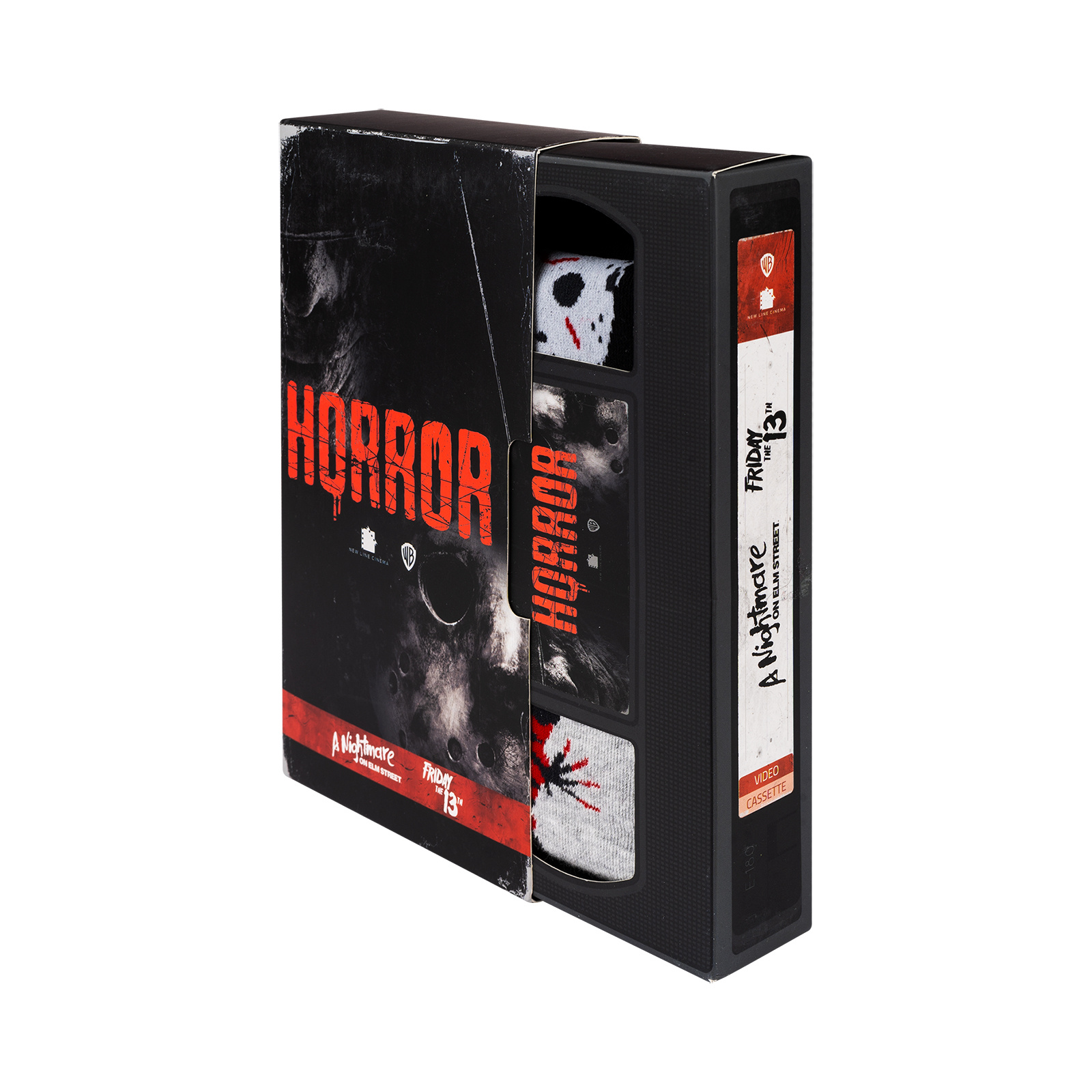 Szukasz pomysłu na prezent? Zdecydowanie ten model będzie hitem! Skarpetki w mrocznej stylistyce zapakowanie w pudełko do złudzenia przypominające klasyczną kasetę VHS to strzał w dziesiątkę. Opakowanie w stylu kasety retro to hołd dla klasyki kina grozy, które w latach 80 i 90 królowało na kasetach VHS.