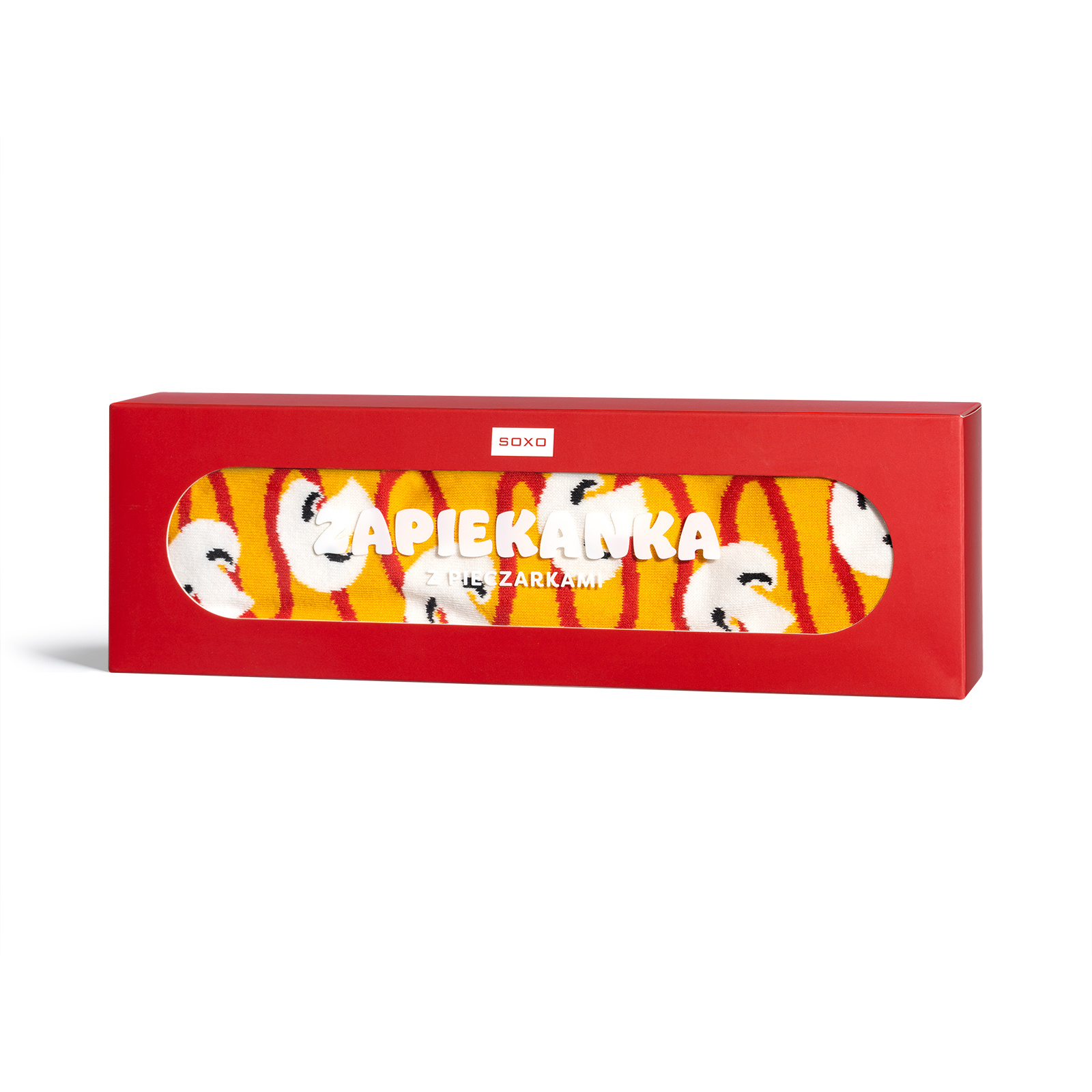 - Wesołe skarpetki z motywem Zapiekanki to idealny dodatek dla miłośników jedzenia i kolorowych akcesoriów. Te nietuzinkowe skarpetki, ozdobione apetycznymi pieczarkami z serem z pewnością przyciągną wzrok i wywołają uśmiech.