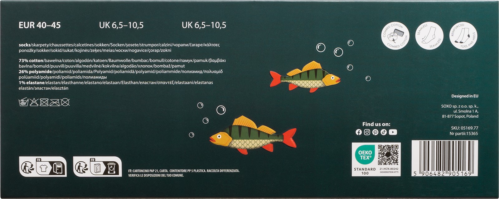 Śmieszne skarpetki są ozdobione wizerunkiem popularnej ryby Okoń. Ich kolor będzie dobrze komponował się z garderobą.