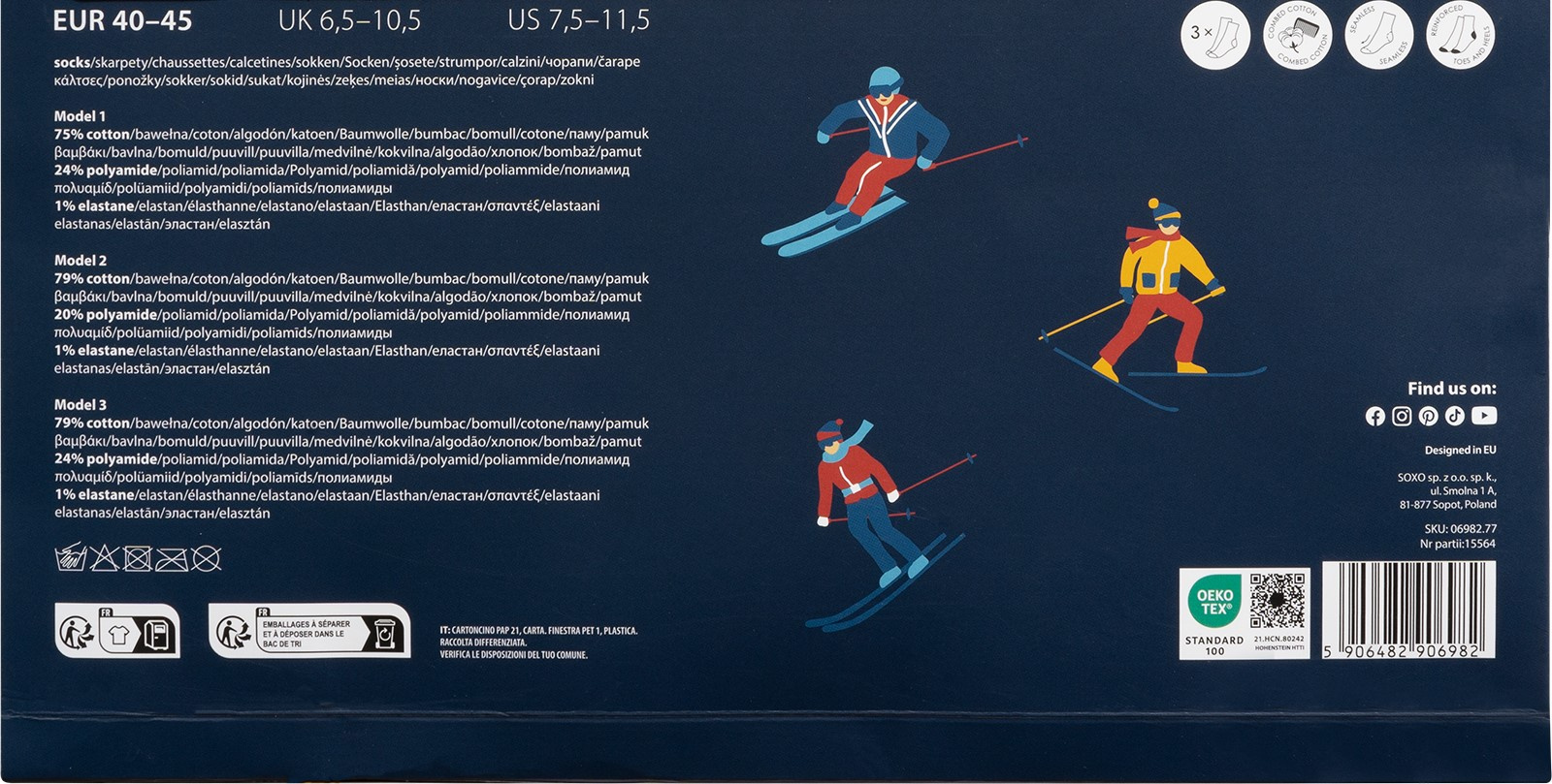 - Wyróżnij się stylowymi skarpetkami SOXO z motywem sportów zimowych! Wykonane z wysokiej jakości bawełny, te kolorowe skarpetki zapewniają komfort i ciepło podczas chłodnych dni. Zabawne wzory inspirowane zimowymi aktywnościami, takimi jak narty, snowboard