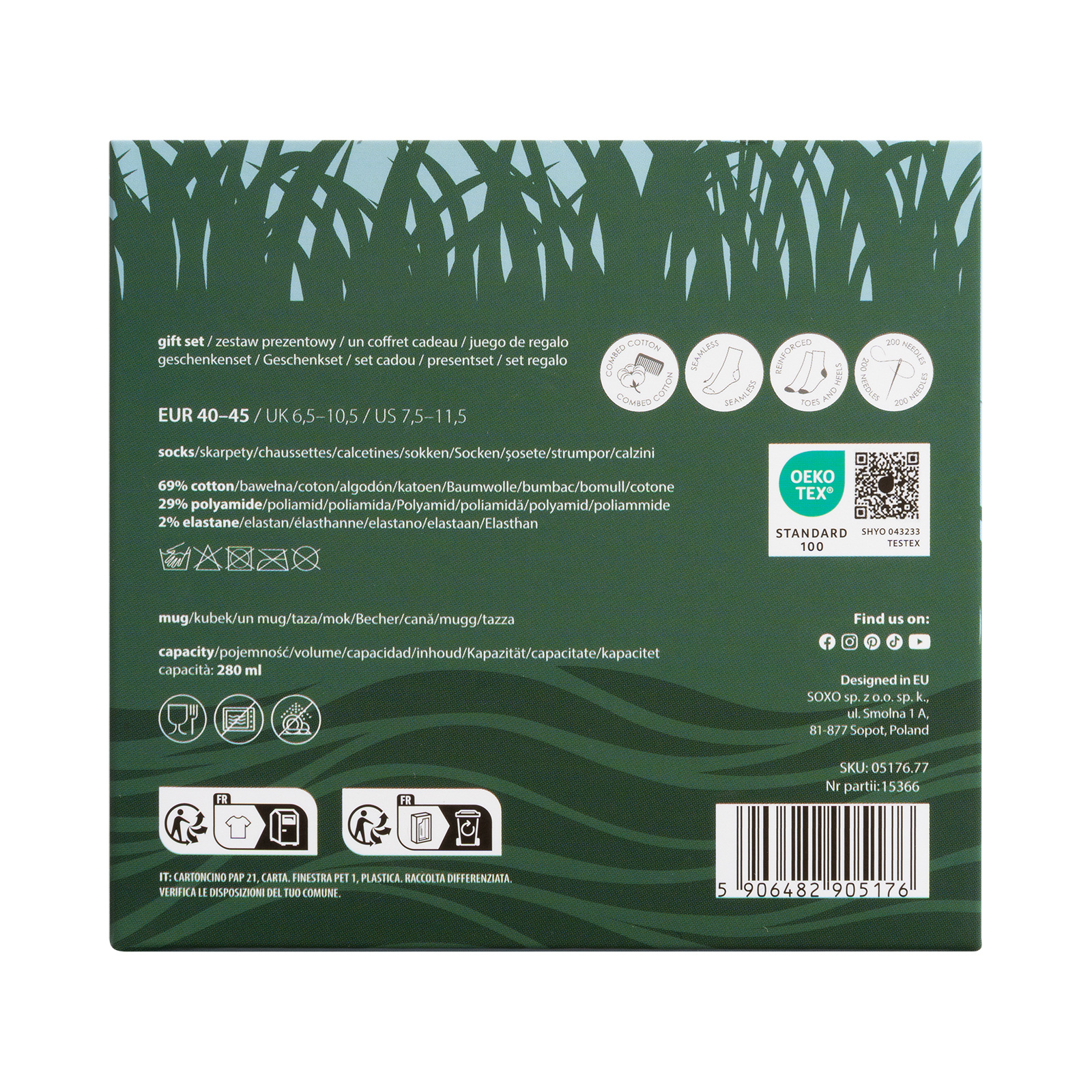 Do skarpetek dołączony jest solidny, elegancki kubek SOXO z motywem ryb, który od razu przyciąga uwagę swoim wyjątkowym wyglądem. Dzięki pojemnemu rozmiarowi idealnie nadaje się do porannej kawy, aromatycznej herbaty lub ulubionego napoju, który można sączyć podczas wypoczynku w domu lub na świeżym powietrzu. Kubek ten sprawdzi się zarówno w kuchni, jak i w biurze – jego trwały materiał i wyrazisty wzór czynią go dodatkiem nie tylko funkcjonalnym, ale także ozdobnym.