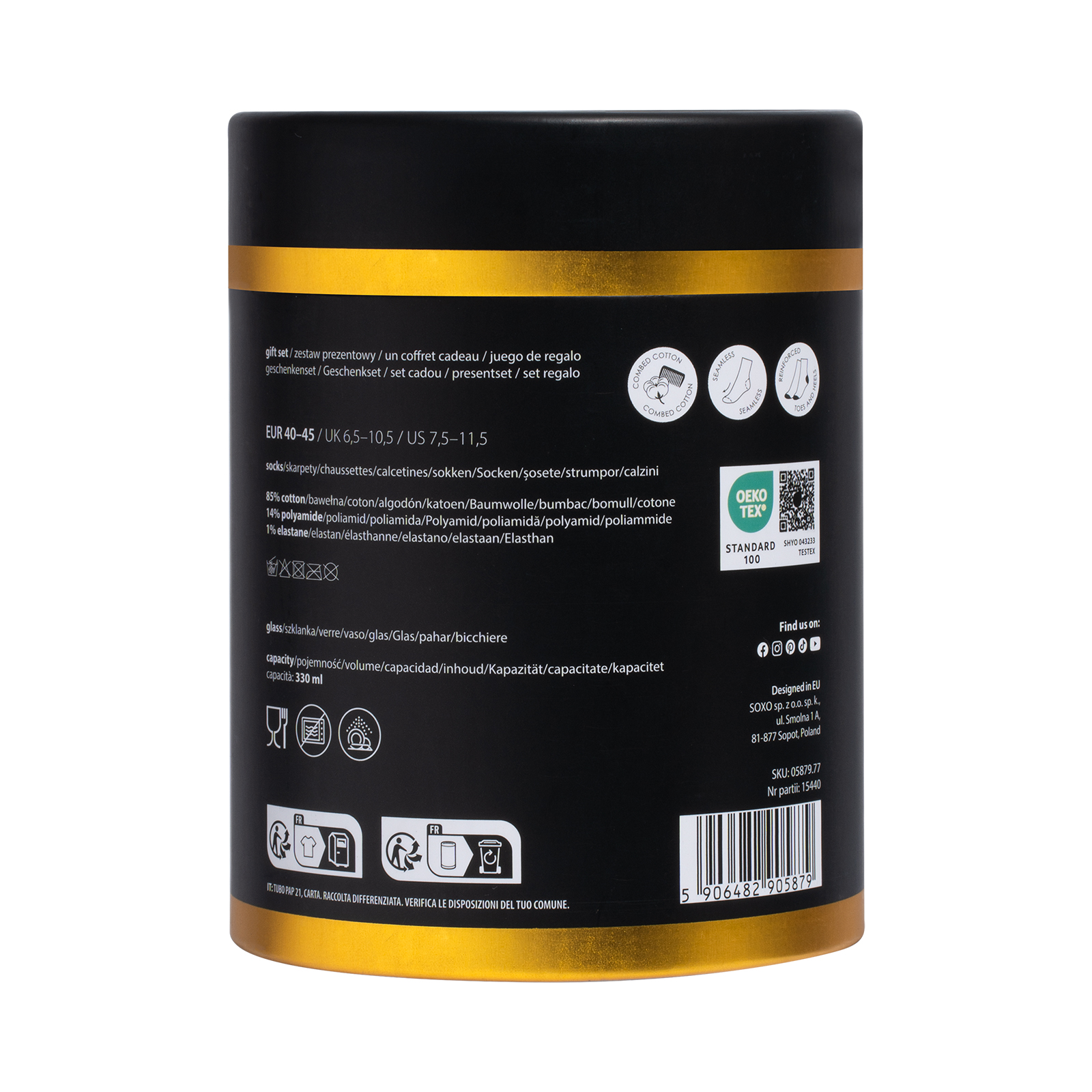 Zapakowane w elegancką szklankę do whiskey, skarpetki stają się gotowym prezentem, który nie wymaga dodatkowego pakowania. Takie opakowanie podkreśla ich wyjątkowy charakter i dodaje całości uroku. Szklanka sama w sobie może stać się później praktycznym elementem wyposażenia – idealnym do serwowania ulubionych trunków.