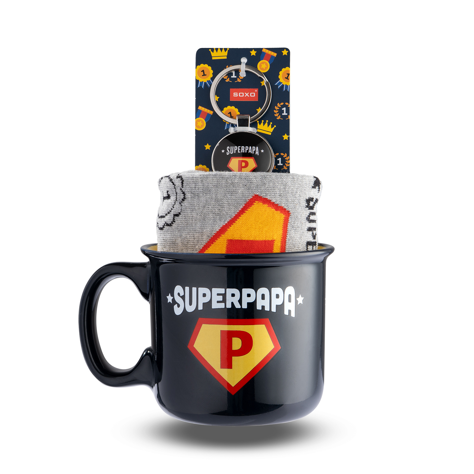 - Co łączy skarpetki męskie i SuperPapę? Obie rzeczy są niezwykłe i niepowtarzalne! Zestaw zawiera skarpetki z napisem "Super Papa", kubek i brelok – idealnie dopasowane i gotowe do wręczenia. Świetny prezent dla ojców z charakterem!