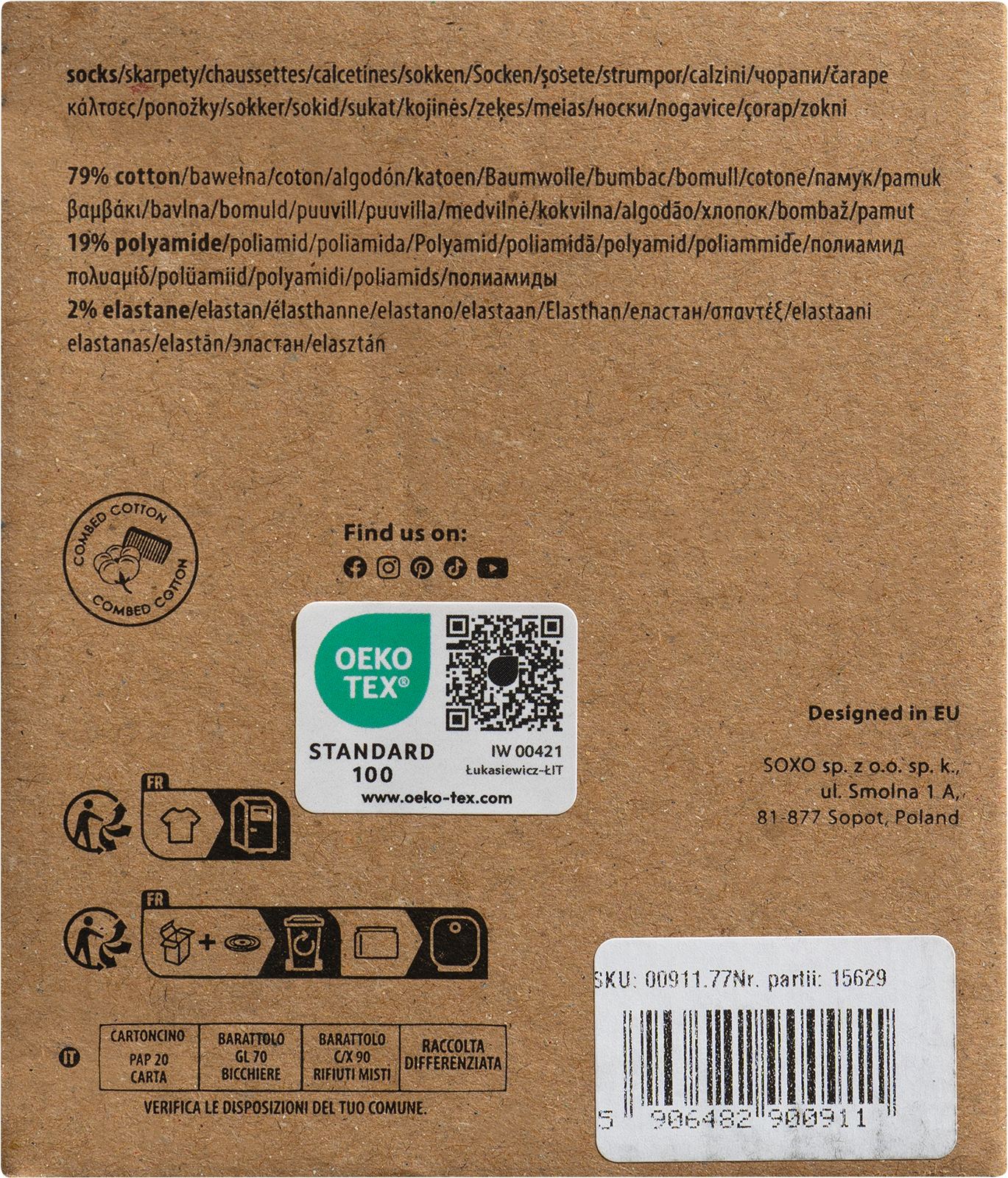 Każda para została wykonana z wysokiej jakości bawełny z dodatkiem elastycznych włókien, co zapewnia wygodę przez cały dzień. Materiał oddycha, odprowadza wilgoć i doskonale dopasowuje się do stopy – bez ucisku i zsuwania się.