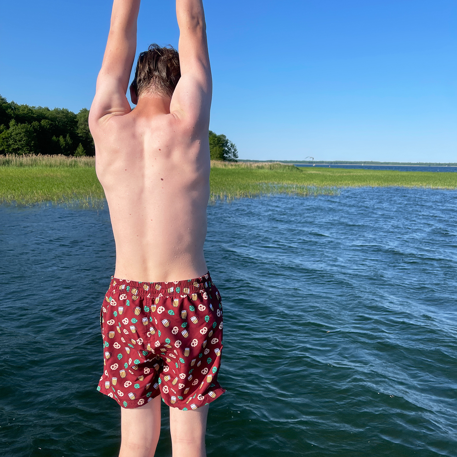 - Zabawne kąpielówki z elastyczną gumą w pasie – wygodne i dopasowane, dostępne w rozmiarach M, L, XL