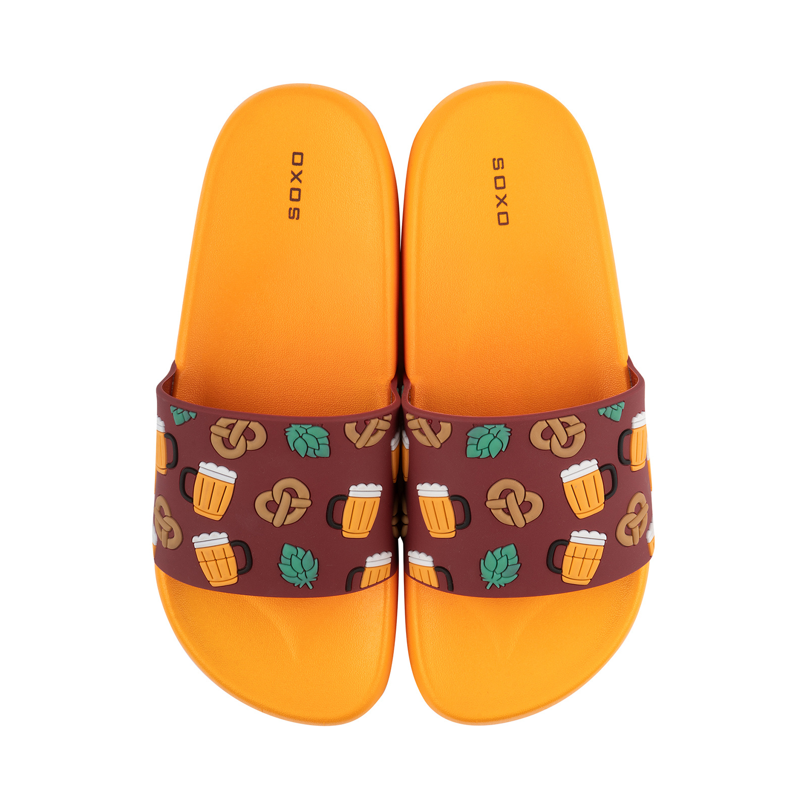 - Klapki z piwnym wzorem – wykonane z miękkiej gumy, z profilowaną podeszwą i łatwe do wyczyszczenia