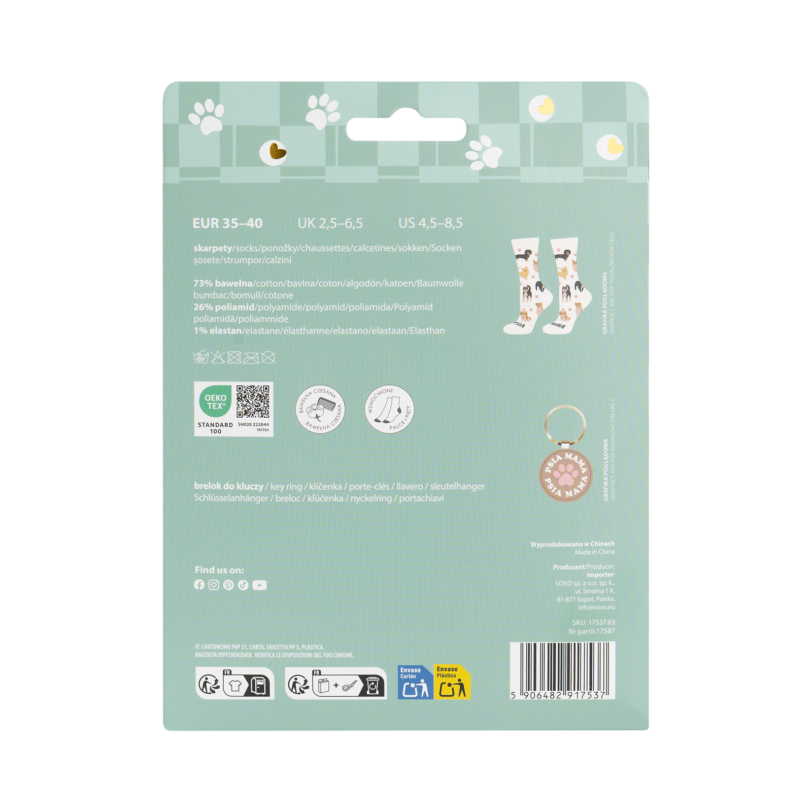 Zestaw skarpetek i brelok „Psia Mama” to idealny prezent dla każdej kobiety, która kocha swoje psy i nie boi się pokazać, kto tu rządzi. W środku znajdziesz długie, wygodne skarpetki oraz dopasowany brelok – razem tworzą zestaw pełen humoru i pozytywnej energii.