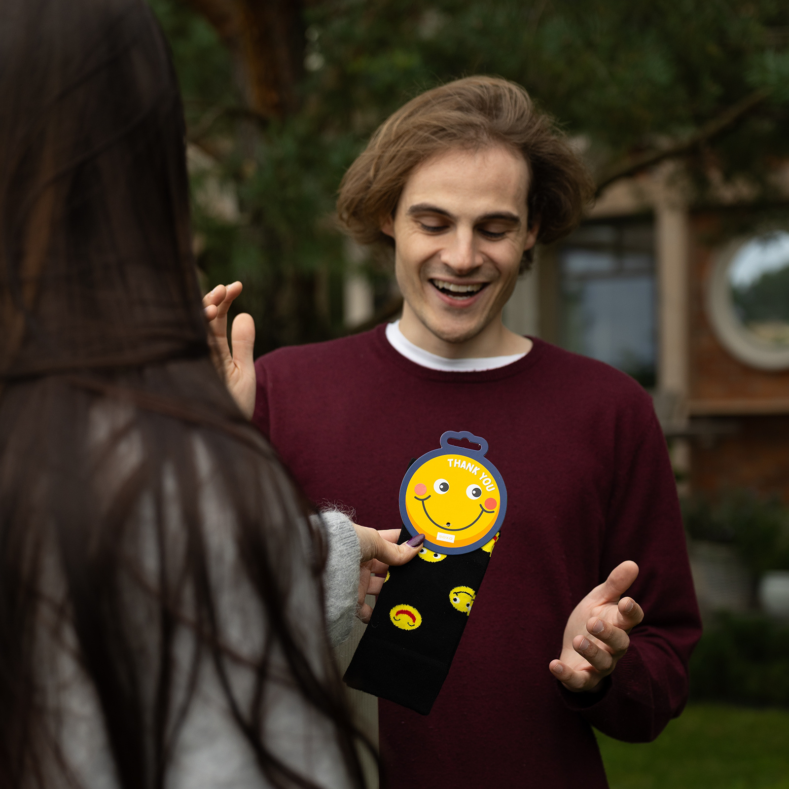 Czarne skarpetki męskie ozdobione żółtymi, wesołymi buźkami to prezent, który łączy wdzięczność z poczuciem humoru. Do kompletu dołączona jest karteczka z napisem „Thank You”, dzięki czemu nie potrzebujesz dodatkowego opakowania – wystarczy wręczyć i cieszyć się reakcją obdarowanego.