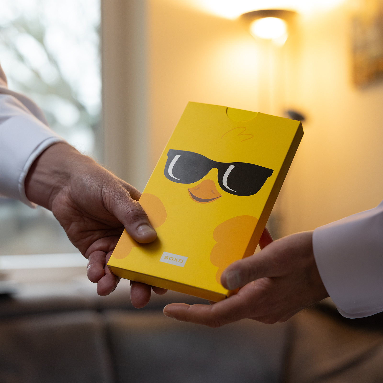 - Skarpetki w uroczym opakowaniu gotowym do wręczenia. Czarne, miękkie i wygodne, z zabawnym akcentem kurczaczka po boku.